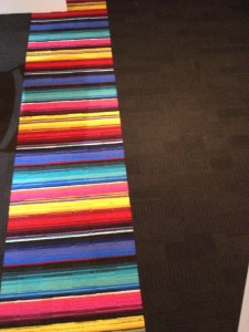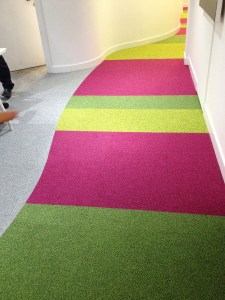 Ahead of our BIG presentation to Penson, I called up Interface a company specialising in commercial carpet tiles to see if they would allow a student to drop in and have a wonder around. I had a wonderful welcome from Veronica Kingsley who showed me around the offices and very kindly talked me through the samples. Veronica is passionate about design and even more passionate about her job – I found her inspirational. Very conveniently she was also the client manager for Penson and knew Anna from Penson, the designer on the LCC project. The company is focused on Green design and often hosts speakers and networking events focused on Green topics. I had absolutely no idea carpet tiles could look so good in a commercial space. Not only are the Interface offices fantastic but the floors are all carpeted with a range of different flooring solutions. I snapped a few shots for research purposes and left with a bag of goodies, including a heavy load of samples for the project.